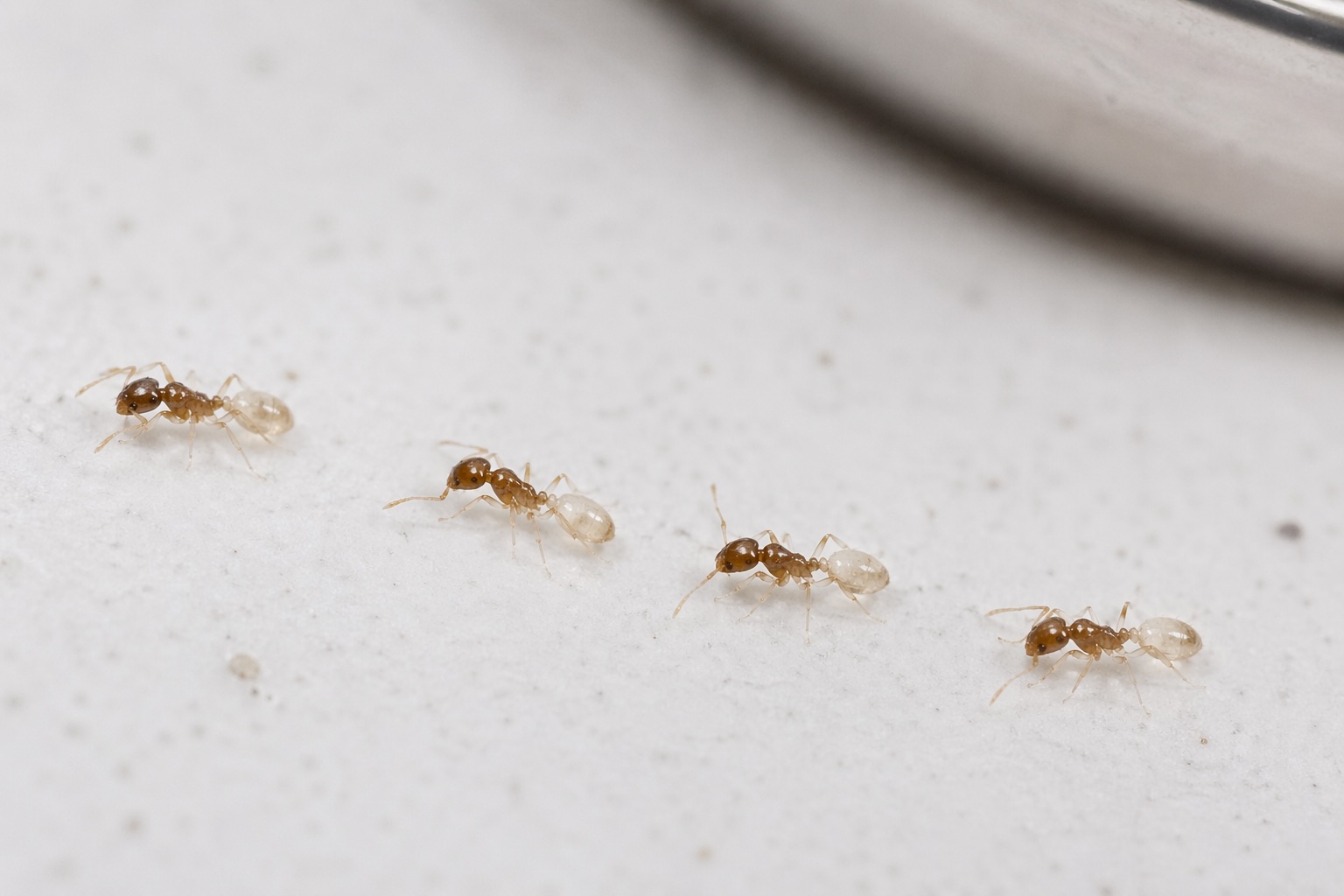 Ghost ants require a bait-based approach — spraying them causes colonies to split and spread. Cadenhead Services uses non-repellent gel baits placed along active trails that workers carry back to queens and larvae, eliminating the full colony structure. Interior treatment is paired with exterior perimeter barrier to prevent re-entry.